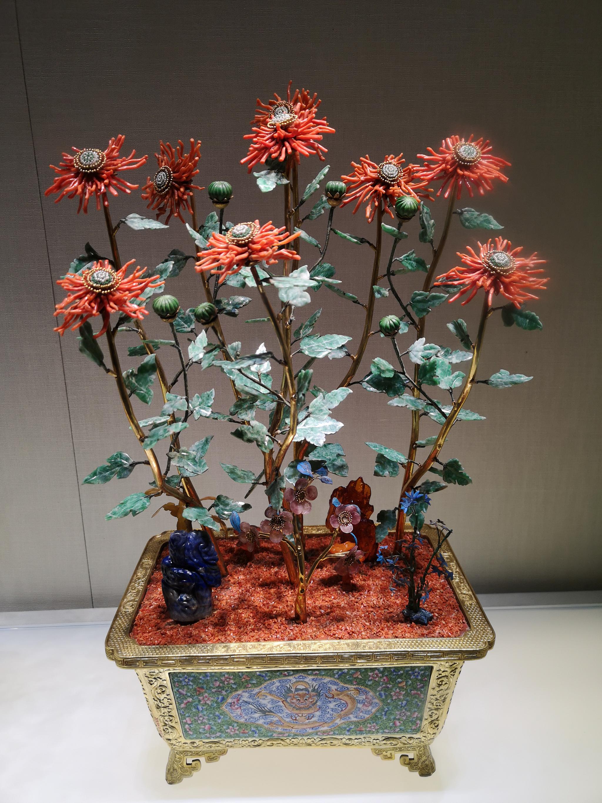 珍宝馆开了一片新馆,展出了大量宫殿陈设的盆景,多用玉、宝石、玻璃、蜜蜡等材料制作,并结合点翠、珐琅、鎏金等工艺,本身就是非常漂亮地工艺品,放在宫廷室内更是使居室美观。